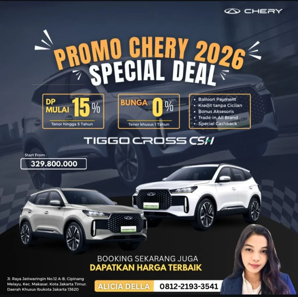 Selamat datang di Chery Jakarta Bekasi! Wujudkan mobil impianmu bersama Chery, pelopor mobilitas ramah lingkungan yang menghadirkan inovasi kendaraan listrik (EV) dan teknologi mesin hemat bahan bakar berstandar emisi global. Dapatkan Promo Chery Terbaru 2026 dengan penawaran serta pelayanan terbaik dari kami. Kami hadir khusus untuk membantu Anda menemukan kendaraan yang sesuai kebutuhan, didukung dengan layanan simulasi budget yang jelas dan transparan. Kini, perjalanan memiliki mobil baru menjadi lebih mudah dengan penawaran uang muka atau dp ringan (TDP mulai dari 10%). Anda dapat memanfaatkan program kredit spesial 50:50 yang dilengkapi dengan bunga mulai dari 0%, sehingga cicilan Anda setiap bulannya menjadi sangat terjangkau. Dengan keringanan angsuran ini, Anda bisa berkendara dengan tenang sambil turut serta dalam kepedulian terhadap bumi.